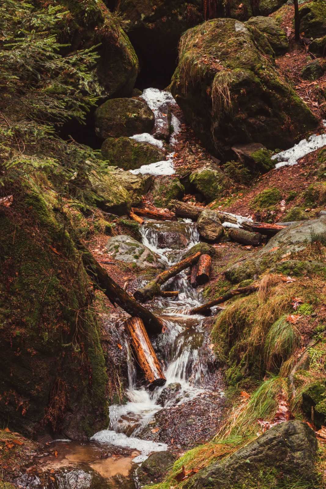 Für den Rückweg, hatte ich was ganz besonderes geplant. Meiner Begleitung, wollte ich einen einmaligen, wunderschönen Weg zeigen, durch die „Schwedenlöcher“ – einer engen Gesteinsformation die einen vermuten lässt, mitten im Urwald zu sein. Ich kannte den Weg schon von einer Sommertour von vor 2 Jahren. Dort ergaben sich die schönsten Fotos meiner letzten Tour. Leider war dieser Weg diesmal nicht ganz so „lockerleicht“ wie ich ihn in Erinnerung hatte. Das Tauwetter hatte hier erst angefangen und verwandelte den kompletten Weg in einen gefährlichen Pfad, mit Eis, Wasserfällen, Bäume die den Weg versperrten und gefährlichen Abgründen, die zwar nicht hoch sind aber einen viele Sorgen bereiten konnten. Es war wie die Wanderung zum Schicksalsberg und ich hatte das schlechteste Gewissen meines Lebens, ich dachte, nach dem Weg wird mich Sandra hassen und nie wieder irgendwas mit mir unternehmen.