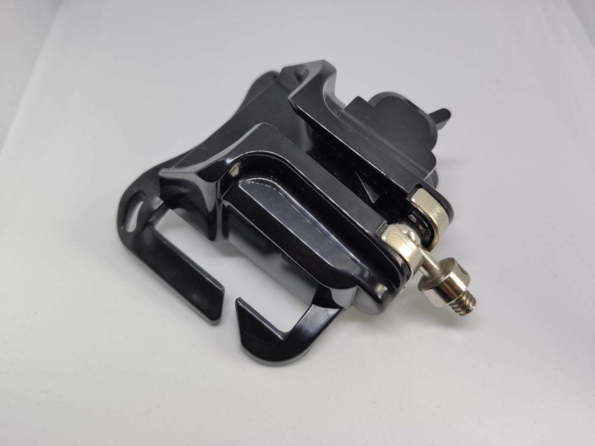 An der Halterung selbst, befindet sich eine Führungsschiene, in dem die Kugelschraube mit Kamera „hereingeschoben“ wird. Der untere Teil dieser Schiene, ist auch mit Metall verstärkt und verleiht so dem Kunststoff deutlich mehr Stabilität. Ein kleiner „Zahn“ verschließt die Schiene und sorgt dafür, dass die Kamera nicht herausfällt. Durch einen kleinen Hebel, kann der Einschub wieder geöffnet werden um die Kamera wieder aus der Halterung zu entfernen – sehr praktisch!